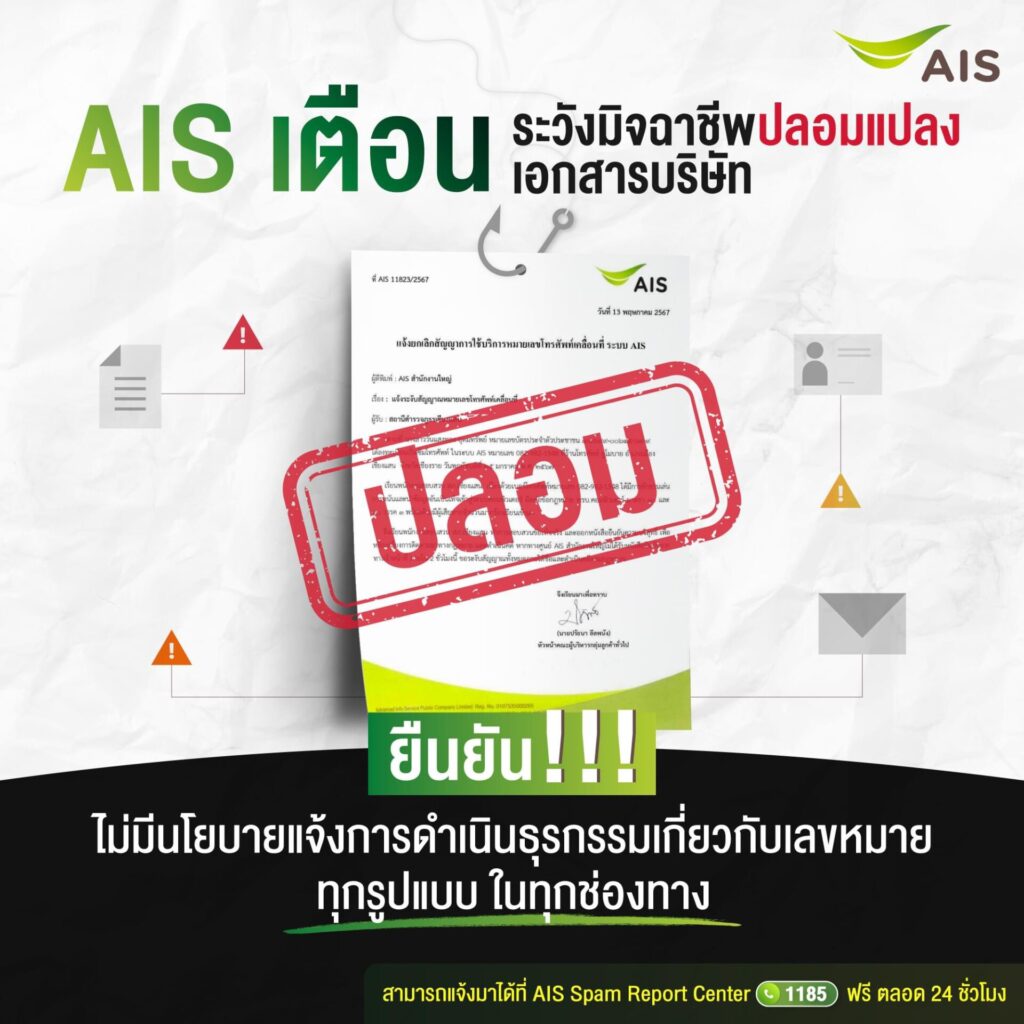 AIS จึงขอแจ้งเตือนลูกค้า และประชาชน อย่าหลงเชื่อกลุ่มมิจฉาชีพที่ปลอมแปลงเอกสาร หรือ ข้อความที่ส่งต่อ โดยขอยืนยันว่า บริษัทไม่มีนโยบายในการส่งเอกสาร หรือ ข้อความในทุกช่องทาง ให้ดำเนินธุรกรรมเกี่ยวกับเลขหมายในทุกรูปแบบ รวมถึงจะไม่มีการทัก หรือ ติดต่อลูกค้าไปในทุกช่องทางเช่นกัน ดังนั้นหากพบเจอ เอกสาร หรือ ข้อความ ในลักษณะดังกล่าว สามารถแจ้งมาได้ที่ AIS Spam Report Center 1185 ฟรี ตลอด 24 ชั่วโมง