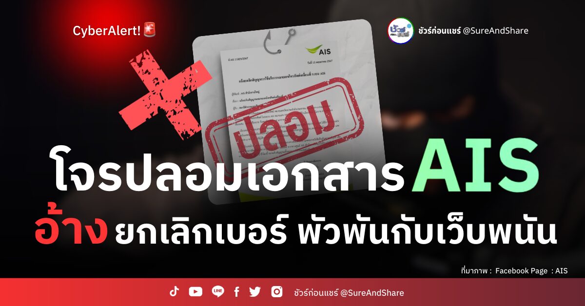 เว็บไซต์และเพจเฟซบุ๊ก AIS ประกาศเตือนระวังมิจฉาชีพปลอมแปลงเอกสารบริษัท ยืนยัน ! ไม่มีนโยบายแจ้งการดำเนินธุรกรรมเกี่ยวกับเลขหมายทุกรูปแบบ ในทุกช่องทาง