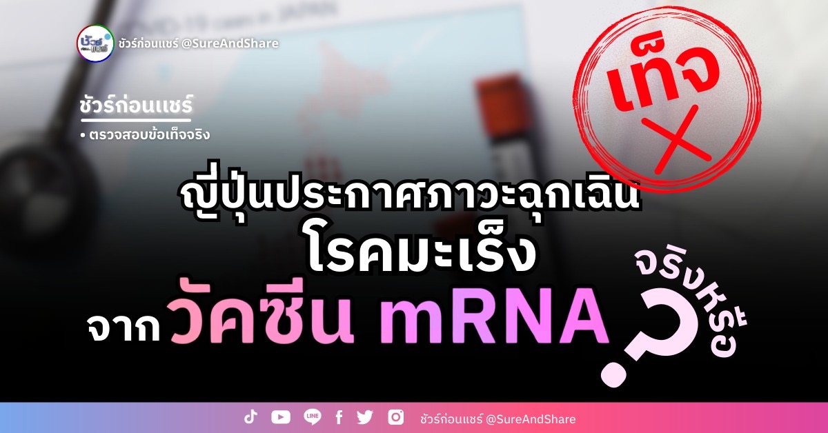 มีข้อมูลเท็จเผยแพร่ผ่านทางเว็บไซต์ในต่างประเทศ เมื่อมีการอ้างว่ารัฐบาลประเทศญี่ปุ่นประกาศภาวะฉุกเฉิน หลังพบหลักฐานที่เชื่อว่ามีการแพร่ระบาดของผู้ป่วยมะเร็งจากการรับวัคซีนโควิด-19 ชนิด mRNA