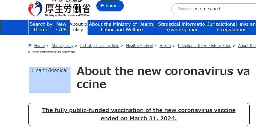 โดยพบว่า ในช่วงเดือนเมษายน 2024 กระทรวงสาธารณสุขญี่ปุ่นได้ปรับเปลี่ยนนโยบายวัคซีนโควิด-19 โดยประกาศว่าให้บริการวัคซีนโควิด-19 แบบไม่คิดค่าใช้จ่าย จะสิ้นสุดลงภายในวันที่ 31 มีนาคม 2024 เท่านั้น แต่ยังมีการฉีดวัคซีนโควิด-19 ในญี่ปุ่นต่อไปเช่นเดิม