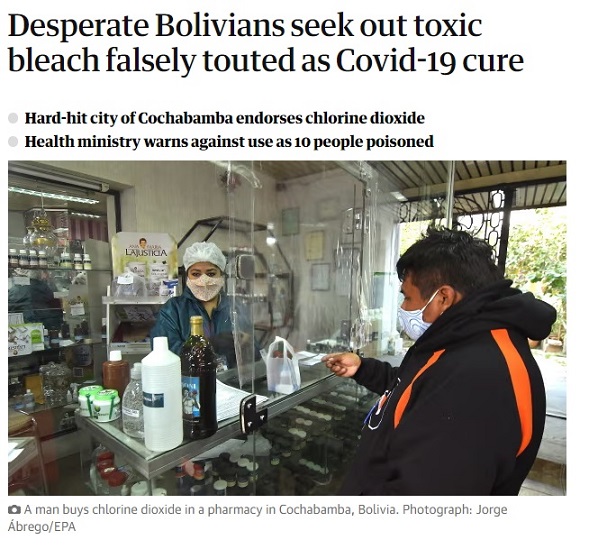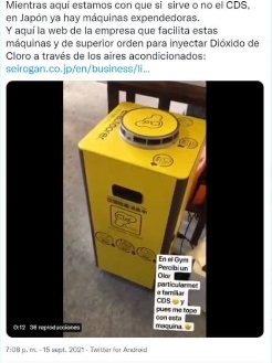 มีข้อมูลบิดเบือนเผยแพร่ทางสื่อสังคมออนไลน์ของผู้ใช้ภาษาสเปน โดยอ้างประเทศญี่ปุ่นมีบริการตู้หยอดเหรียญจำหน่ายน้ำ CDS สำหรับฆ่าเชื้อโควิด-19 โดยเฉพาะ