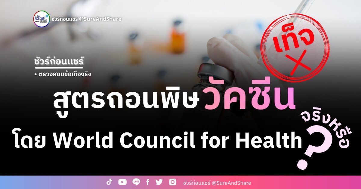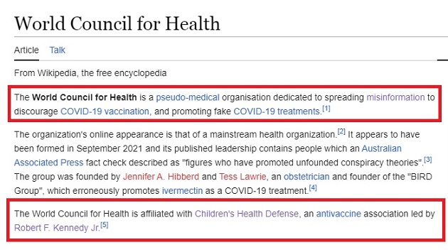 - World Council for Health คือองค์การแพทย์ปลอม ๆ ที่ตั้งขึ้นมาเพื่อเผยแพร่ข่าวปลอมเกี่ยวกับวัคซีนและวัคซีนโควิด-19 โดยเฉพาะ