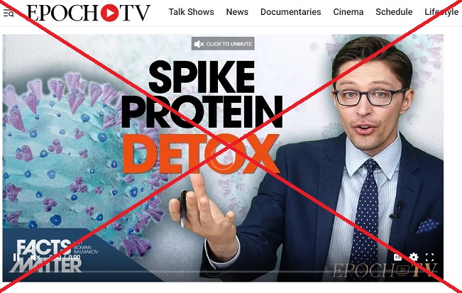 Epoch Times ยังอ้างว่าควรล้างพิษโปรตีนหนามของวัคซีนออกจากร่างกาย โดยอ้างอิงคำแนะนำจาก World Council for Health องค์การแพทย์ปลอม ๆ ที่ตั้งขึ้นมาเพื่อเผยแพร่ข่าวปลอมเกี่ยวกับวัคซีนและวัคซีนโควิด-19 โดยเฉพาะ
