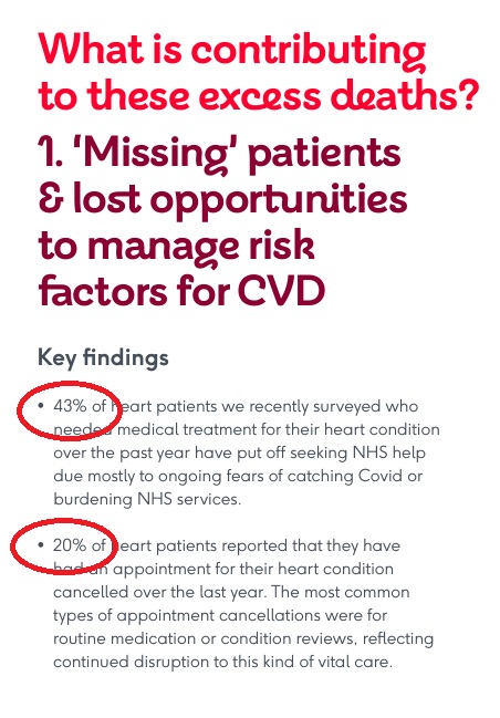 ข้อมูลดังกล่าวนำมาจากผลสำรวจโดยมูลนิธิโรคหัวใจของอังกฤษ หรือ British Heart Foundation ที่ระบุว่าตั้งแต่เดือนมีนาคมปี 2020 ถึงสิงหาคมปี 2022 พบยอดการเสียชีวิตส่วนเกินด้วยโรคหัวใจขาดเลือด (Ischemic heart disease, IHD) ในประเทศอังกฤษถึง 30,000 ราย