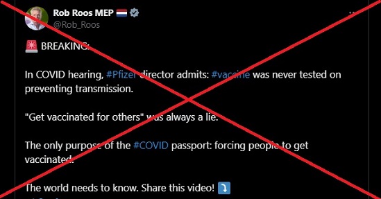 มีข้อมูลบิดเบือนแพร่ทางคลิปวิดีโอทาง X (Twitter) ในสหรัฐอเมริกา เมื่อ ร็อบ รูส์ สมาชิกรัฐสภายุโรปชาวดัตช์ อ้างว่าผู้บริหารของ Pfizer บริษัทผู้ผลิตวัคซีนโควิด-19 ยอมรับว่า บริษัทไม่เคยทดสอบการป้องกันการแพร่เชื้อหลังการฉีดวัคซีน ดังนั้นการรณรงค์ให้ประชาชนเข้ารับการฉีดวัคซีนโควิด-19 จึงเป็นเรื่องหลอกลวง