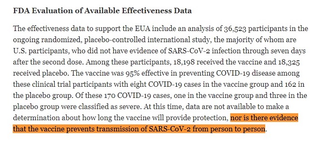 แถลงการณ์ขององค์การอาหารและยาแห่งชาติสหรัฐอเมริกา (FDA) และองค์การยาของสหภาพยุโรป (EMA) หลังการอนุมัติวัคซีนโควิด-19 สำหรับการใช้ในกรณีฉุกเฉิน ได้ระบุประเด็นด้านประสิทธิผลการป้องกันการติดเชื้อและการป่วยหนักจากไวรัสโควิด-19 แต่ไม่มีข้อมูลยืนยันว่าวัคซีนจะป้องกันการติดเชื้อและป่วยจากไวรัสได้นานแค่ไหน และไม่มีหลักฐานว่าวัคซีนจะป้องกันการแพร่เชื้อจากคนสู่คนได้หรือไม่