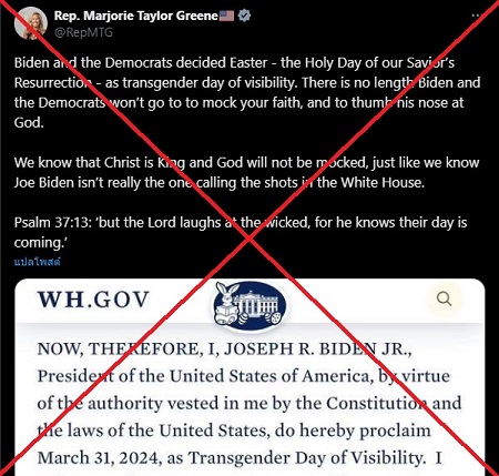 มีข้อมูลสร้างความเข้าใจผิดเผยแพร่ทางสื่อสังคมออนไลน์ในสหรัฐอเมริกา โดยอ้างว่า โจ ไบเดน ประธานาธิบดีสหรัฐอเมริกาของพรรคเดโมแครต กระทำการดูหมิ่นคริสต์ศาสนิกชน ด้วยการเลือกให้วันฉลองคนข้ามเพศตรงกับวันอีสเตอร์ วันสำคัญของศาสนาคริสต์ จนถูกนักการเมืองฝั่งรีพับลิกันนำไปเป็นประเด็นโจมตีอย่างแพร่หลาย