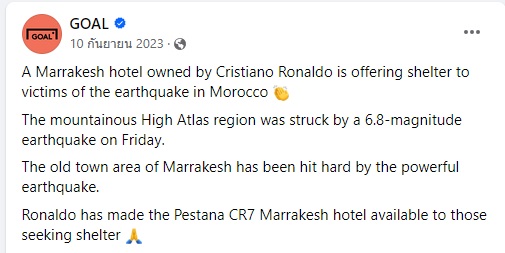 มีข้อมูลเท็จเผยแพร่ทาง Facebook ในต่างประเทศ ที่อ้างว่า คริสเตียโน โรนัลโด นักฟุตบอลทีมชาติโปรตุเกส แสดงน้ำใจด้วยการเปลี่ยนโรงแรมที่เขาร่วมลงทุนในประเทศโมร็อกโก ให้กลายเป็นที่ลี้ภัยฉุกเฉินแก่เหยื่อเหตุแผ่นดินไหวครั้งใหญ่ในประเทศโมร็อกโกเมื่อปี 2023