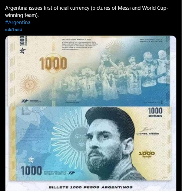 ส่วนภาพธนบัตร 1,000 เปโซพิมพ์ใบหน้า ลิโอเนล เมสซี ที่แชร์ทางออนไลน์ นอกจากจะไม่ใช่ธนบัตรของจริงแล้ว การออกแบบยังขัดแย้งกับการอ้างว่าเป็นธนบัตรฉลองการคว้าแชมป์โลกของอาร์เจนตินา เนื่องจากด้านหลังของธนบัตรเป็นภาพทีมชาติอาร์เจนตินาฉลองการคว้าชัยในรายการ Finalissima เมื่อเดือนมิถุนายน 2022 ไม่ใช่ภาพการคว้าแชมป์โลกในเดือนธันวาคม 2022 แต่อย่างใด
