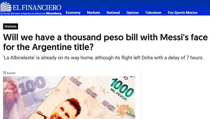 โดยบทความอ้างว่าประเทศอาร์เจนตินาเคยผลิตเหรียญที่ระลึกเพื่อฉลองการคว้าแชมป์โลกครั้งแรกเมื่อปี 1978 มาแล้ว พร้อมอ้างว่าตัวแทนธนาคารกลางของอาร์เจนตินามีความคิดที่จะพิมพ์ใบหน้าของเมสซีบนธนบัตร 1,000 เปโซ เนื่องจากมีความเชื่อมโยงกับหมายเลข 10 ซึ่งเป็นหมายเลขประจำตัวของ ลิโอเนล เมสซี ทั้งในทีมชาติและสโมสร