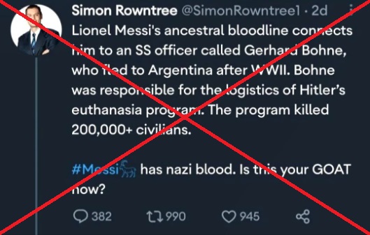 มีข้อมูลเท็จเผยแพร่ทาง Instagram เพื่อใส่ร้ายชาติกำเนิดของ ลิโอเนล เมสซี นักฟุตบอลทีมชาติอาร์เจนตินา โดยอ้างว่าหนึ่งในบรรพบุรุษของเมสซีคือ แกร์ฮาร์ด โบฮ์เนอ สมาชิกหน่วยเอสเอสของพรรคนาซีสมัยสงครามโลกครั้งที่ 2