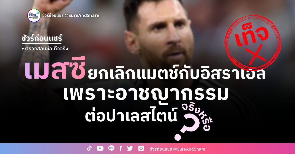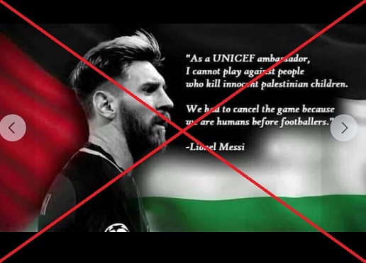 มีข้อมูลบิดเบือนเผยแพร่ทางสื่อสังคมออนไลน์ในต่างประเทศ ที่อ้างว่า ลิโอเนล เมสซี กัปตันทีมชาติอาร์เจนตินาได้เปิดใจต่อ TyC Sports สำนักข่าวกีฬาของอาร์เจนตินา ถึงการยกเลิกการแข่งขันฟุตบอลนัดอุ่นเครื่องกับทีมชาติอิสราเอลช่วงก่อนการแข่งขันฟุตบอลโลกเมื่อปี 2018 โดยให้เหตุผลว่า ในฐานะที่เขาเป็นทูตองค์การยูนิเซฟ เขาไม่สามารถแข่งขันกีฬาร่วมกับชนชาติที่สังหารเด็ก ๆ ปาเลสไตน์ผู้บริสุทธิ์ เราจึงต้องยกเลิกการแข่งขัน เพราะเราให้ความสำคัญต่อความเป็นมนุษย์มาก่อนการเป็นนักฟุตบอล