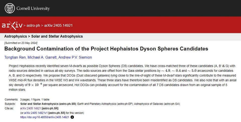 ผลวิจัยพบว่า ดาวแคระแดง 3 จาก 7 ดวงที่เชื่อว่าเป็นที่อยู่ของ Dyson Sphere มีความเป็นไปได้ว่าอาจจะเป็นแค่ผลจากการแผ่รังสีฟาร์ อินฟราเรดจาก Quasar ชนิดหนึ่งที่เรียกว่า Hot Dust-Obscured Galaxy (Hot DOG) ซึ่งอยู่บริเวณใจกลางของกาแล็กซีชนิด Active Galactic Nucleus