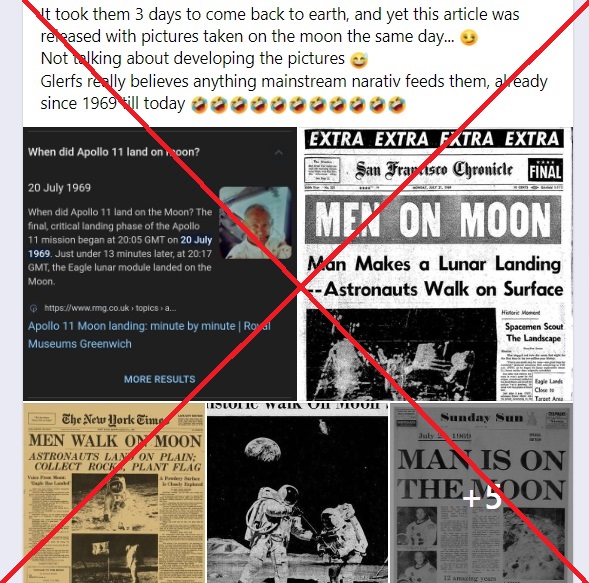 มีข้อมูลสร้างความเข้าใจผิดเผยแพร่ทางสื่อสังคมออนไลน์ โดยอ้างว่าหนึ่งในหลักฐานที่ทำให้เชื่อว่าการสำรวจดวงจันทร์ของยาน Apollo 11 เป็นเรื่องลวงโลก คือหนังสือพิมพ์หลายสำนักสามารถตีพิมพ์ภาพการสำรวจดวงจันทร์เพียงหนึ่งวัน หลัง นีล อาร์มสตรอง พิชิตดวงจันทร์ได้สำเร็จ ทั้ง ๆ ที่ต้องใช้เวลาอีก 3 วัน กว่านักบินอวกาศจะเดินทางกลับมายังโลก และยังต้องใช้เวลาอีกหลายวัน กว่าจะล้างภาพได้สำเร็จและส่งไปยังหนังสือพิมพ์แต่ละสำนัก