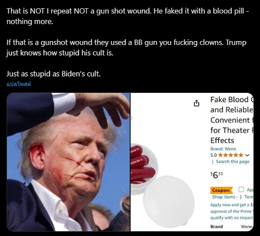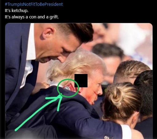 มีข้อมูลบิดเบือนเผยแพร่ทางสื่อสังคมออนไลน์ในสหรัฐอเมริกา กล่าวหาว่า โดนัลด์ ทรัมป์ ผู้สมัครชิงตำแหน่งประธานาธิบดีสหรัฐฯ ของพรรครีพับลิกัน จัดฉากลอบสังหารด้วยการใช้เลือดปลอม ทั้งภาพที่พบว่าเขาแอบเอาซองใส่ซอสมะเขือเทศแนบไว้ด้านหลังคอเสื้อ หรือข้ออ้างเรื่องการใช้แคปซูลเลือดปลอม