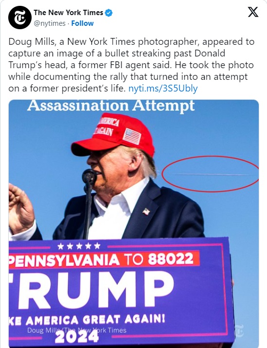 นอกจากนี้ ยังมีภาพถ่ายของ ดัก มิลส์ ช่างภาพหนังสือพิมพ์ New York Times ที่สามารถบันทึกลูกกระสุนที่ยิงโดนหูของ โดนัลด์ ทรัมป์ เอาไว้เป็นหลักฐานอีกด้วย