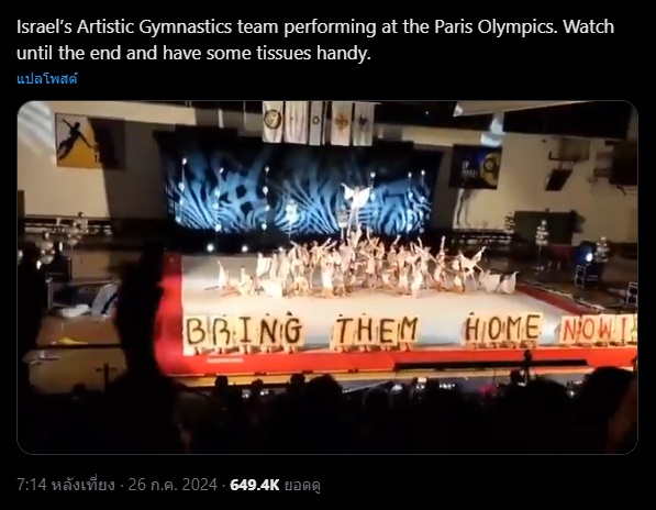 ส่วนภาพการแสดงข้อความ Bring Them Home Now ของนักกีฬายิมนาสติก ก็เป็นการแสดงของนักกีฬาจากโรงเรียนยิมนาสติกของอิสราเอล เปิดการแสดงเมื่อวันที่ 15 กรกฎาคม 2024 ที่ผ่านมา หรือก่อนที่กีฬาโอลิมปิกจะเริ่มขึ้น
