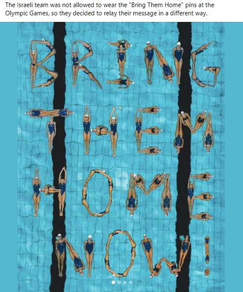 มีข้อมูลบิดเบือนเผยแพร่ทางสื่อสังคมออนไลน์ในต่างประเทศ โดยอ้างว่านักกีฬาว่ายน้ำและยิมนาสติกของประเทศอิสราเอล ใช้การแข่งขันกีฬาโอลิมปิกเป็นเวทีกดดันรัฐบาลอิสราเอลให้เร่งนำตัวประกันชาวยิวที่ถูกจับกุมโดยกลุ่มฮามาสกลับมายังมาตุภูมิ ผ่านการแสดงออกด้วยข้อความ Bring Them Home Now ระหว่างการแข่งขัน เพื่อเป็นการประท้วงคำสั่งของโอลิมปิกที่ห้ามนักกีฬาอิสราเอลประดับเข็มกลัด Bring Them Home Now ระหว่างการแข่งขัน