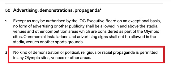 - กฎบัตรโอลิมปิกห้ามการใช้สถานที่ใด ๆ ของการจัดกีฬาโอลิมปิกเพื่อเผยแพร่ข้อความที่เกี่ยวข้องกับการเมือง ศาสนา และประเด็นด้านเชื้อชาติ