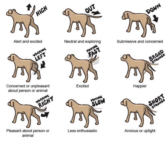ข้อมูลจากเว็บไซต์ Adelaide Vet ระบุว่า อารมณ์ของสุนัขสังเกตได้จากตำแหน่งของหางและลักษณะการสั่นหาง
