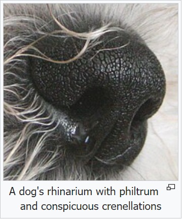 Rhinarium คือส่วนปลายจมูกซึ่งเป็นผิวชนิดพิเศษที่หลั่งความชุ่มชื้น และทำให้สุนัขมีความสามารถพิเศษในการดมกลิ่น โดยดึงดูดและละลายโมเลกุลของกลิ่นเพื่อให้รับกลิ่นได้ง่ายขึ้น