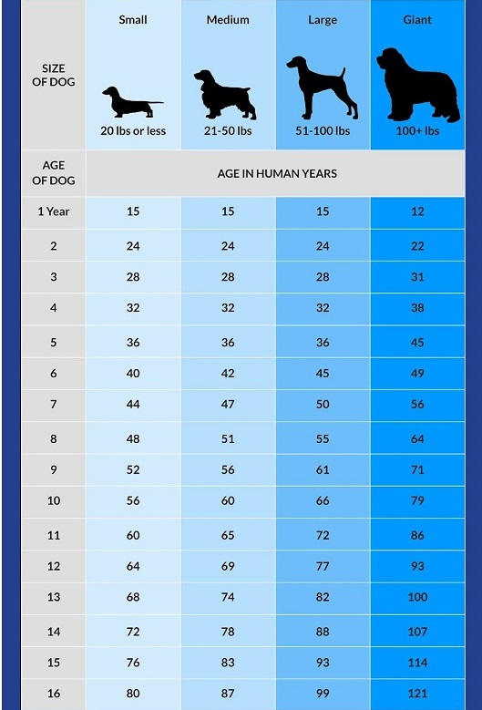 เมื่ออายุ 10 ปี สุนัขที่มีน้ำหนักตัวมากกว่า 45 กิโลกรัม จะมีอายุเท่ากับมนุษย์ในวัย 79 ปี
