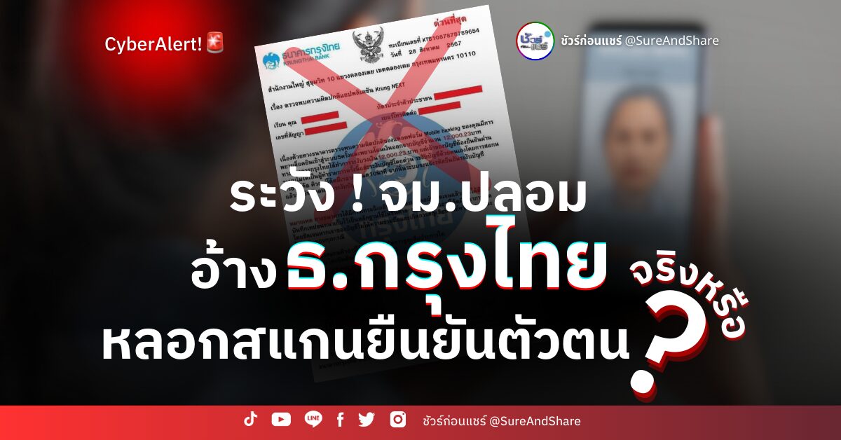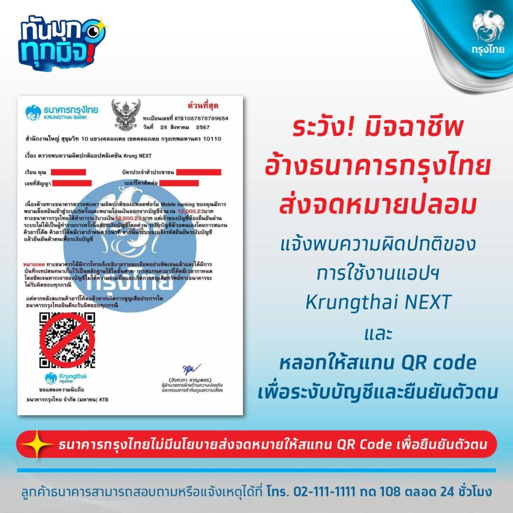 เพจเฟซบุ๊กธนาคารกรุงไทย ประกาศเตือน ระวัง ! มิจฉาชีพอ้างธนาคารกรุงไทยส่งจดหมายปลอม แจ้งพบความผิดปกติของการใช้งานแอปฯ Krungthai NEXT และหลอกให้สแกน QR Code เพื่อระงับบัญชีและยืนยันตัวตน