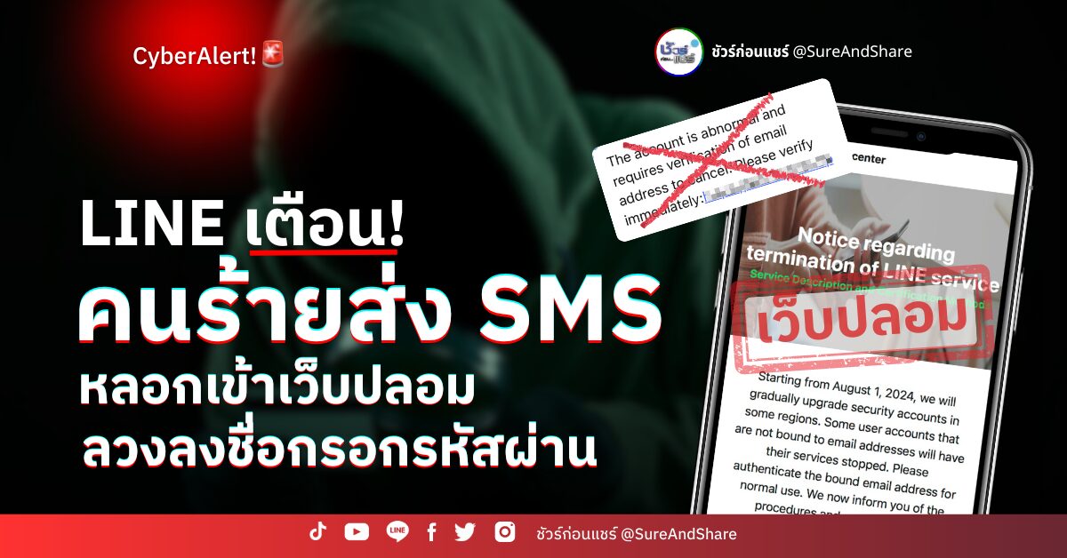 30 สิงหาคม 2567 LINE Thailand – Official ประกาศเตือน ผู้ใช้ LINE : ขณะนี้ มี SMS แปลกปลอม แอบอ้างชื่อ LINE แจ้งว่าบัญชีของท่านผิดปกติ โดยให้คลิกลิงก์ไปยังเว็บไซต์ปลอม รวมถึงหน้าให้ล็อกอิน เพื่อกรอกอีเมลและพาสเวิร์ด