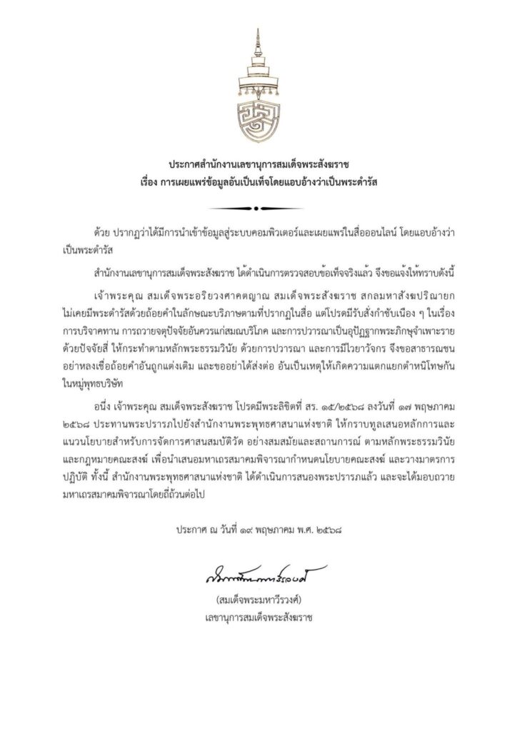 สำนักงานเลขานุการสมเด็จพระสังฆราช ได้ดำเนินการตรวจสอบข้อเท็จจริงแล้ว จึงขอแจ้งให้ทราบดังนี้