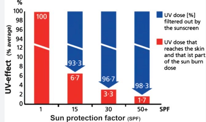 SPF คือระดับการป้องกันรังสี UVB มีค่าตั้งแต่ 6 จนถึง 50+ ยิ่งค่า SPF สูงระดับการป้องกันผิวหนังจากรังสี UVB จะยิ่งมีประสิทธิภาพ