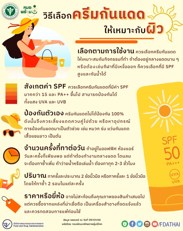 หลักเกณฑ์การเลือกใช้ครีมกันแดด ขึ้นอยู่กับความเข้มของสีผิวของผู้ใช้ ระดับของรังสียูวีในแต่ละช่วงเวลา และระยะเวลาในการทำกิจกรรมกลางแจ้ง