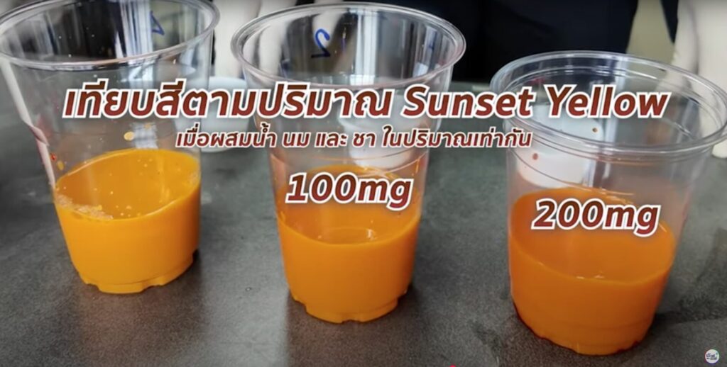 ผู้เชี่ยวชาญจากคณะอุตสาหกรรมเกษตร มหาวิทยาลัยเกษตรศาสตร์ ได้ยืนยันอย่างชัดเจนว่า สีส้มของชาไทยส่วนใหญ่มาจาก สีผสมอาหารสังเคราะห์ที่เรียกว่า Sunset Yellow (ซันเซ็ต เยลโลว์) แต่แม้จะเป็นสีสังเคราะห์ Sunset Yellow ไม่ได้เป็นสารอันตรายอย่างที่หลายคนกังวล หากอยู่ภายใต้การควบคุมและบริโภคในปริมาณที่เหมาะสม ผู้เชี่ยวชาญยืนยันว่า Sunset Yellow เป็น สีผสมอาหารที่ได้รับอนุญาตตามกฎหมาย และถือว่าปลอดภัยสำหรับการบริโภคภายใต้ขีดจำกัดที่กำหนด