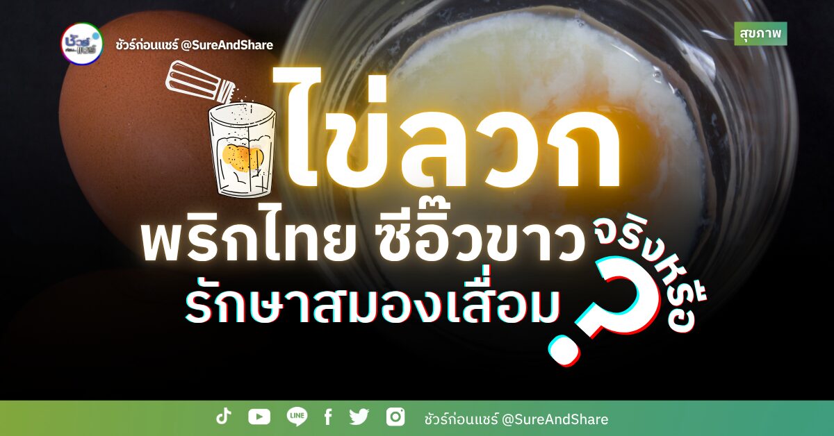 บนสื่อสังคมออนไลน์มีการแชร์แนะนำว่า หลง ๆ ลืม ๆ สมองเสื่อม สมองฝ่อ อัลไซเมอร์ ให้กินไข่ลวก ไข่แดง ไข่ขาวไม่สุก วันละ 2 ฟอง ใส่พริกไทยมาก ๆ ใส่ซีอิ๊วขาวดับคาว ช่วยให้ความจำดี รักษาอาการหลงลืมได้ จริงหรือ ?