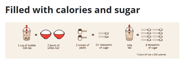 ดังนั้นการบริโภคชานมไข่มุกเกินกว่าวันละ 1 แก้ว อาจทำให้ร่างกายได้รับน้ำตาลมากกว่าที่ควรได้รับในแต่ละวัน