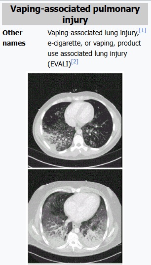 ปี 2020 ศูนย์ควบคุมและป้องกันโรคแห่งชาติสหรัฐอเมริกา (CDC) รายงานพบผู้ป่วยโรคปอดจากการใช้บุหรี่ไฟฟ้า (E-cigarette or Vaping use-Associated Lung Injury : EVALI) จำนวน 2,807 เคสในสหรัฐฯ และมีผู้เสียชีวิตจากโรค EVALI ในขณะนั้นจำนวน 68 ราย