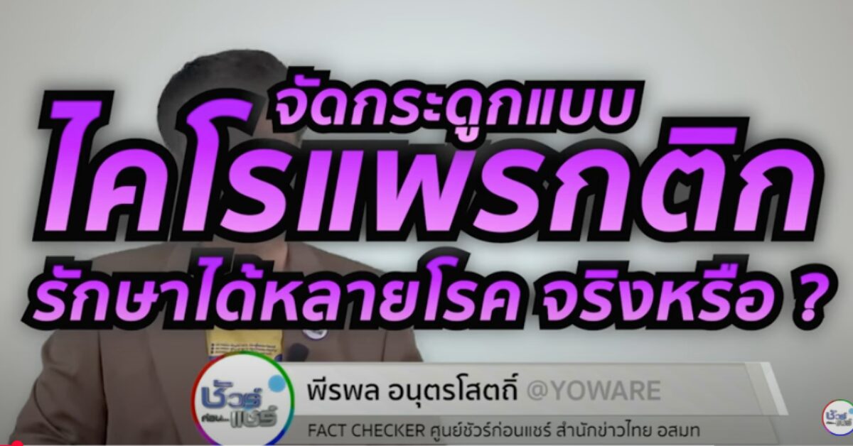 13 มิถุนายน 2568 – บนโซเชียลแชร์ว่า ไคโรแพรคติก (Chiropractic) เป็นการแพทย์ทางเลือก สามารถรักษาโรคต่าง ๆ ได้ เช่น กระดูกทับเส้นประสาท ไมเกรน พาร์กินสัน ออฟฟิศซินโดรม กระดูกสันหลังคด หรือแม้แต่ทำให้สูงขึ้นได้