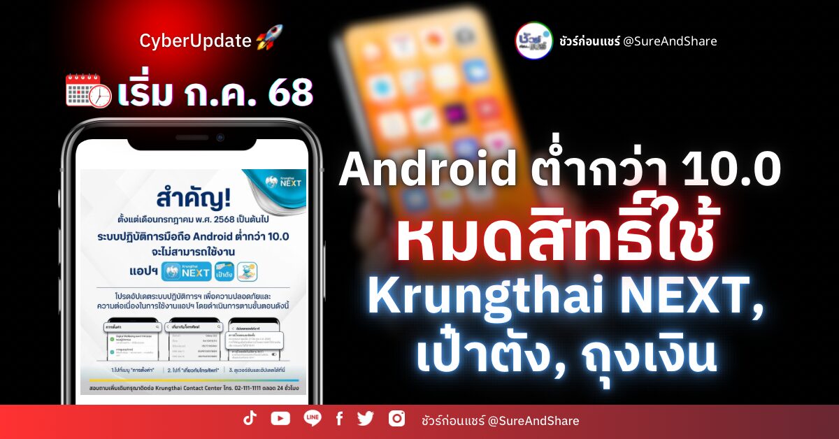 ตั้งแต่เดือนกรกฏาคม 2568 เป็นต้นไป ผู้ใช้งานระบบปฏิบัติการมือถือแอนดรอยส์ ต่ำกว่าเวอร์ชัน 10.0 จะไม่สามารถใช้งานแอปฯ Krungthai NEXT เป๋าตัง และ ถุงเงินได้ โปรดอัปเดตระบบปฏิบัติการฯ เพื่อเพิ่มความปลอดภัยและความต่อเนื่องในการใช้งานแอปฯ โดยดำเนินการได้ตามขั้นตอนดังนี้