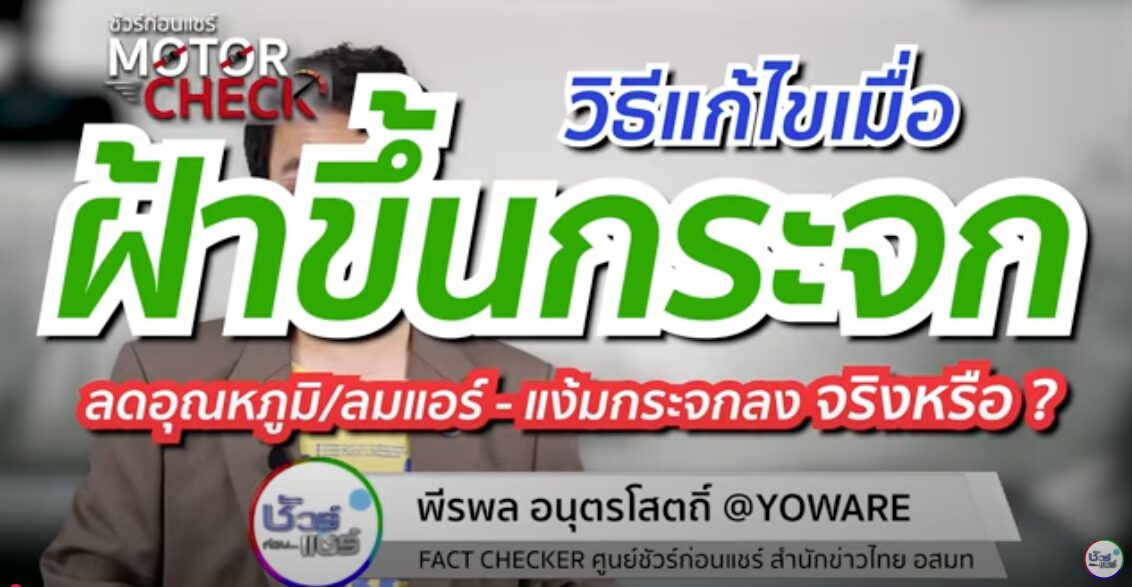 24 มิถุนายน 2568 – บนสังคมออนไลน์มีการแชร์ วิธีแก้ไข เมื่อเกิดฝ้าขึ้นบนกระจกขณะขับขี่รถยนต์ เช่น ลดอุณหภูมิและความแรงพัดลมแอร์ และ แง้มกระจกรถยนต์ลง เรื่องนี้จริงหรือไม่ ติดตามได้ใน ซีรีส์ ชัวร์ก่อนแชร์ มอเตอร์เช็ก กับคุณพีรพล อนุตรโสตถิ์ จากศูนย์ชัวร์ก่อนแชร์