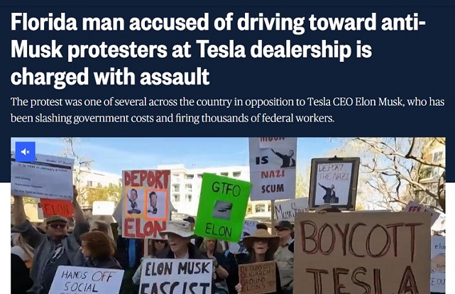 เมื่อมีนาคม 2025 มีเหตุการณ์จับกุมชายในเมืองปาล์มบีช รัฐฟลอริดา ในข้อหาการทำร้ายร่างกายโดยใช้อาวุธร้ายแรงโดยไม่มีเจตนาฆ่า หลังจากจำเลยค่อย ๆ ขับรถขึ้นไปบนทางเท้าและตรงไปยังผู้ชุมนุมประท้วง ก่อนจะชะลอรถจนผู้ชุมนุมถอยออกไปโดยไม่มีใครได้รับบาดเจ็บ