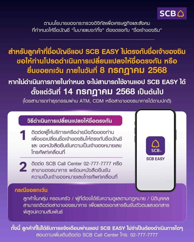4 กรกฎาคม 2568 – ธนาคารไทยพาณิชย์ แจ้งเตือนลูกค้าที่ใช้บริการแอปพลิเคชัน SCB EASY ให้ดำเนินการเปลี่ยนแปลง ชื่อบัญชีให้ตรงกับชื่อเจ้าของซิม หรือ ยื่นขอยกเว้น ภายในวันที่ 8 กรกฎาคม 2568 เพื่อยกระดับความปลอดภัยตามนโยบายภาครัฐ หากไม่ดำเนินการภายในเวลาที่กำหนด ท่านจะไม่สามารถใช้งานแอป SCB EASY ได้ตั้งแต่วันที่ 14 กรกฎาคม 2568 เป็นต้นไป แต่ยังสามารถทำธุรกรรมผ่าน ATM, CDM หรือสาขาได้ตามปกติ