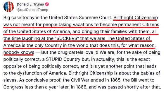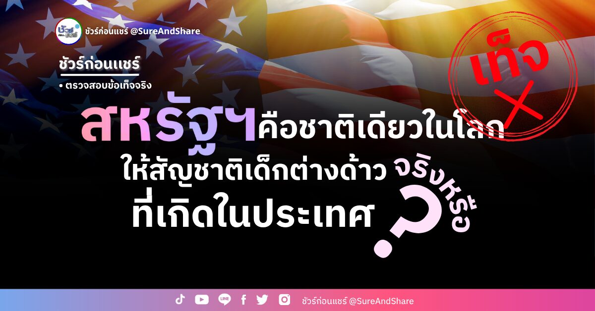 มีข้อมูลเท็จเกี่ยวกับนโยบายตรวจคนเข้าเมืองสหรัฐฯ เผยแพร่ทางสื่อสังคมออนไลน์ เมื่อ โดนัลด์ ทรัมป์ ประธานาธิบดีสหรัฐฯ ประกาศทางสื่อ Truth Social เมื่อวันที่ 15 พฤษภาคม 2025 ว่า สหรัฐอเมริกาเป็นประเทศเดียวในโลกที่มอบสัญชาติให้กับเด็กต่างด้าวที่มาเกิดในประเทศ