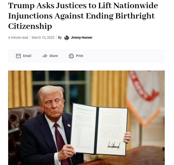 เมื่อวันที่ 20 มกราคม 2025 ซึ่งตรงกับวันที่ โดนัลด์ ทรัมป์ เริ่มทำงานในทำเนียบขาวในฐานะผู้นำสหรัฐฯ ครั้งที่ 2 เป็นวันแรก มีการเซ็นอนุมัติคำสั่งของฝ่ายบริหารหรือ Executive Order 14160 เพื่อปฏิเสธการมอบสัญชาติอเมริกันให้กับทารกที่เกิดจากผู้อพยพผิดกฎหมายหรือมาพักอาศัยชั่วคราวในสหรัฐฯ