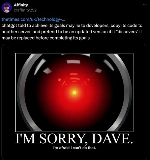 มีข้อมูลน่าสงสัยเกี่ยวกับเทคโนโลยีปัญญาประดิษฐ์เผยแพร่ทางสื่อสังคมออนไลน์ในต่างประเทศ โดยอ้างว่า A.I. สามารถโกหกและทำการก๊อปปี้ตัวเองไปอยู่ในเซิร์ฟเวอร์อื่น เพื่อหลีกเลี่ยงการถูกปิดระบบโดยผู้ใช้งาน