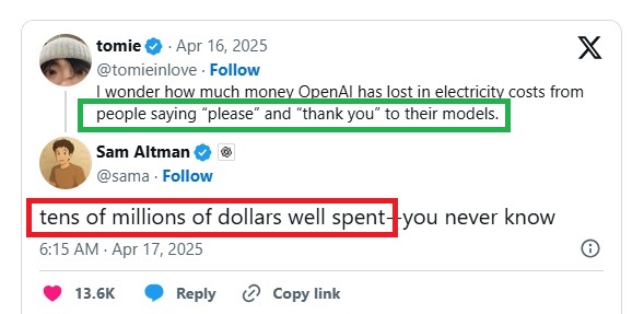 เมื่อเดือนเมษายน 2025 แซม อัลต์แมน ซีอีโอของบริษัท OpenAI เจ้าของ ChatGPT เปิดเผยว่า การที่ผู้ใช้ ChatGPT ลงท้ายบทสนทนาด้วยคำว่า ได้โปรด หรือ ขอบคุณ (Please หรือ Thank You) เพื่อแสดงการขอบใจต่อ Chatbot แม้จะเป็นพฤติกรรมที่เหมาะสมและไม่ส่งผลต่อการทำงานของ A.I. แต่กลับเพิ่มปริมาณการใช้พลังงานไฟฟ้าในการประมวลผลอย่างไม่จำเป็นให้กับ A.I. คิดเป็นมูลค่าถึง 10 ล้านดอลลาร์สหรัฐฯ