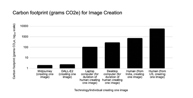 งานวิจัยปี 2024 ทางวารสาร Scientific Reports พบว่าการใช้ A.I. ผลิตผลงานบทความและรูปภาพ ปลดปล่อยปริมาณคาร์บอนน้อยกว่าการใช้แรงงานคน