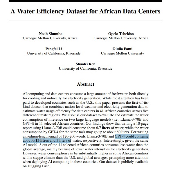 งานวิจัยปี 2024 พบว่า GPT-4 Model ของ ChatGPT ซึ่งเปิดตัวเมื่อปี 2023 ต้องใช้น้ำถึง 3 ลิตรสำหรับการเขียนอีเมลจำนวน 120-200 คำ