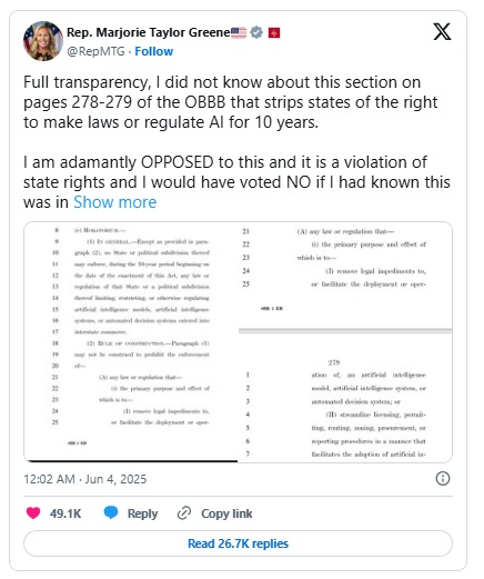 แม้แต่ มาร์จอรี เทย์เลอร์ กรีน ผู้แทนราษฎรรัฐจอร์เจีย พรรครีพับลิกัน เปิดเผยว่า ถ้าเธอรู้ว่า One Big Beautiful Bill Act ห้ามไม่ให้รัฐออกกฎหมายควบคุม A.I. นานนับทศวรรษ เธอจะไม่ออกเสียงสนับสนุนร่างกฎหมายตัวนี้แน่นอน