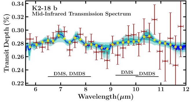 ซึ่งทีมวิจัยพบว่าบนดาวเคราะห์ K2-18b มีปริมาณสาร DMS สูงกว่าบนโลกถึง 20 เท่า ซึ่งการที่สาร DMS สลายตัวได้ง่าย มีความเป็นไปได้สูงที่สาร DMS จะถูกผลิตออกมาอย่างต่อเนื่องบนดาวเคราะห์ K2-18b
