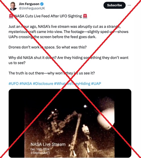 มีข้อมูลเท็จเกี่ยวกับ UFO เผยแพร่ทาง X ในต่างประเทศ เมื่อมีการโพสต์คลิปวิดีโอที่อ้างว่าเป็นหลักฐานการพบ UFO ใกล้ ๆ กับสถานีอวกาศนานาชาติ แต่สัญญาณภาพที่ส่งมายังโลกกลับถูก NASA ยับยั้งการเผยแพร่กะทันหัน