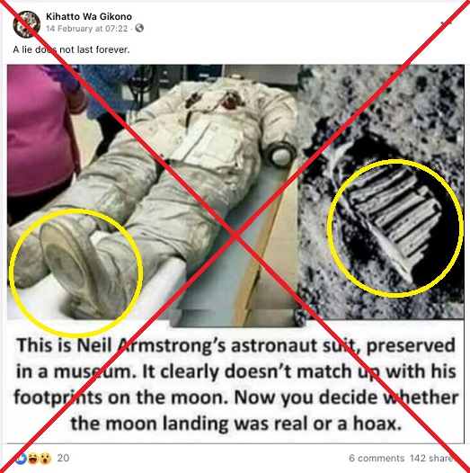 มีข้อมูลเท็จเกี่ยวกับโครงการ Apollo เผยแพร่ทางสื่อสังคมออนไลน์ในต่างประเทศ โดยอ้างว่าภารกิจการส่งมนุษย์ไปเยือนดวงจันทร์ของสหรัฐฯ เป็นเรื่องลวงโลก เพราะมีการเปิดเผยชุดอวกาศที่ นีล อาร์มสตรอง สวมใส่บนดวงจันทร์ แต่ปรากฏว่ารอยของรองเท้าในชุดอวกาศ กลับแตกต่างจากรอยเท้าที่ประทับไว้บนผิวของดวงจันทร์อย่างสิ้นเชิง